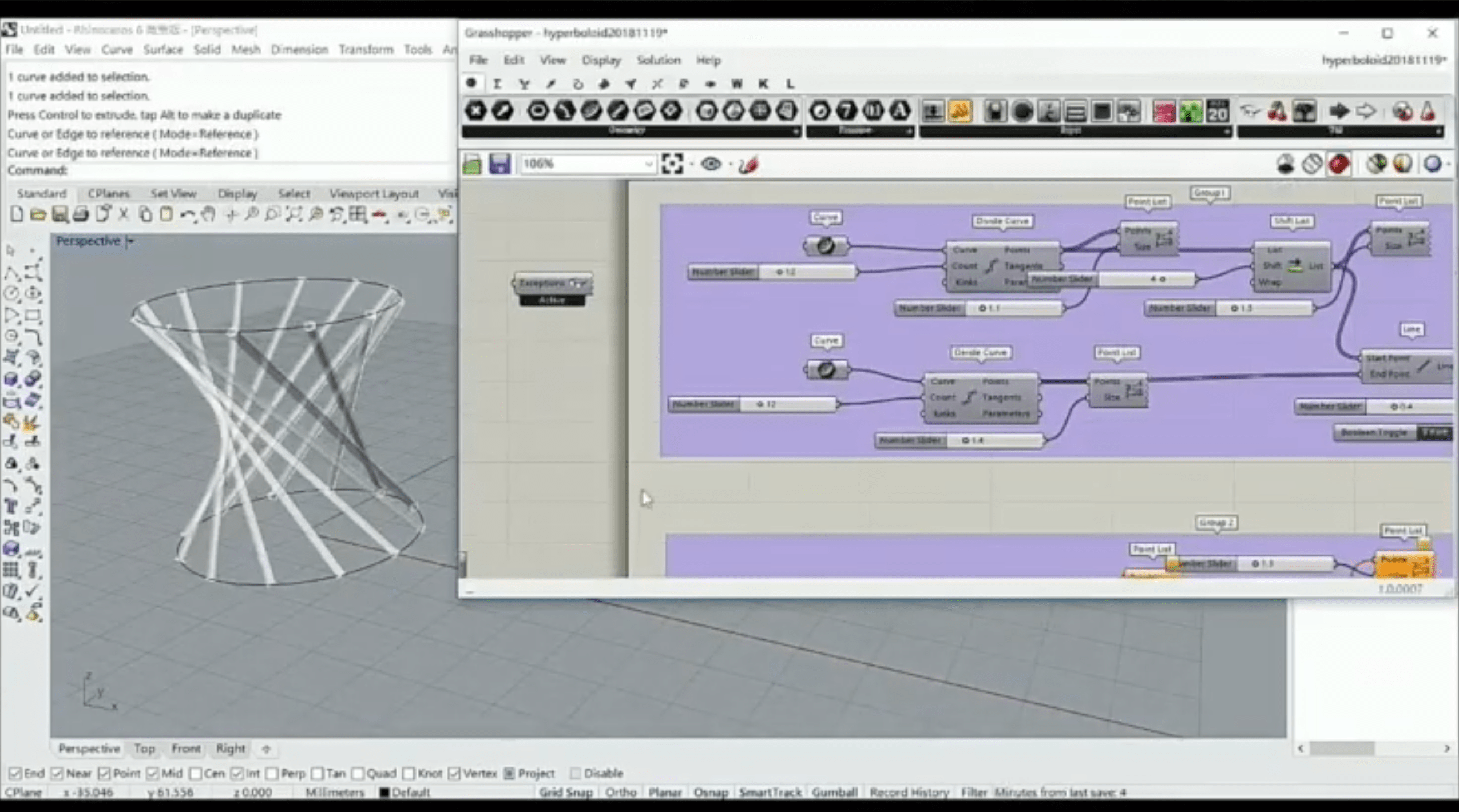 在十九世紀的時候,人們常喜歡用穿線法去做直紋的曲面模型,現在我們結合現代科技,我們可以直接在電腦裡畫圖,您可以寫一個架構,接著你只要去改變裡面的參數—例如支架的數量—就可以改變它的架構。這在電腦上是非常直觀的,您改變哪個參數,模型的哪邊就會直接被調整。調整好後,就可以直接透過3D列印去將它列印出來。「印製的光照過程也非常漂亮。」老師提道。